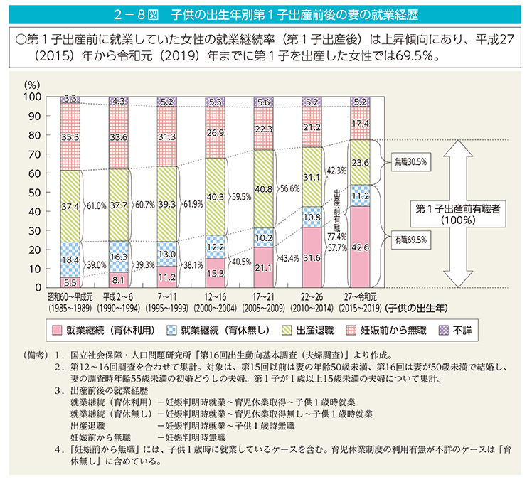 出典|2-8図 子供の出生年別第1子出産前後の妻の就業経歴 | 内閣府男女共同参画局