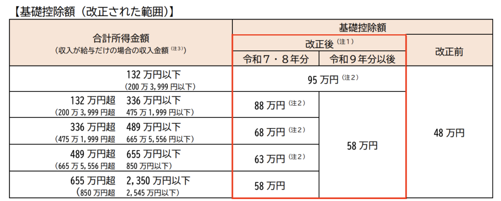 これまで一律48万円だった基礎控除額が、58万円(所得200万4,000円未満は95万円)に引き上げられました。