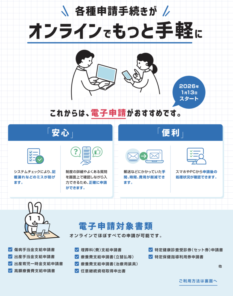 これまで郵送や窓口で行っていた「健康保険の現金給付申請」などを、