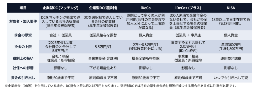 企業型DC(マッチング拠出・選択制)、iDeCo、iDeCo+、NISAの違いと使い分け