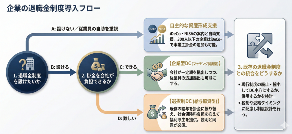 従業員300人以下で企業年金がない中小企業であれば、「iDeCo+(イデコプラス)」を活用し、少額の事業主掛金を上乗せして支援する選択肢も有効です。 - 「設ける/福利厚生を充実させる」場合